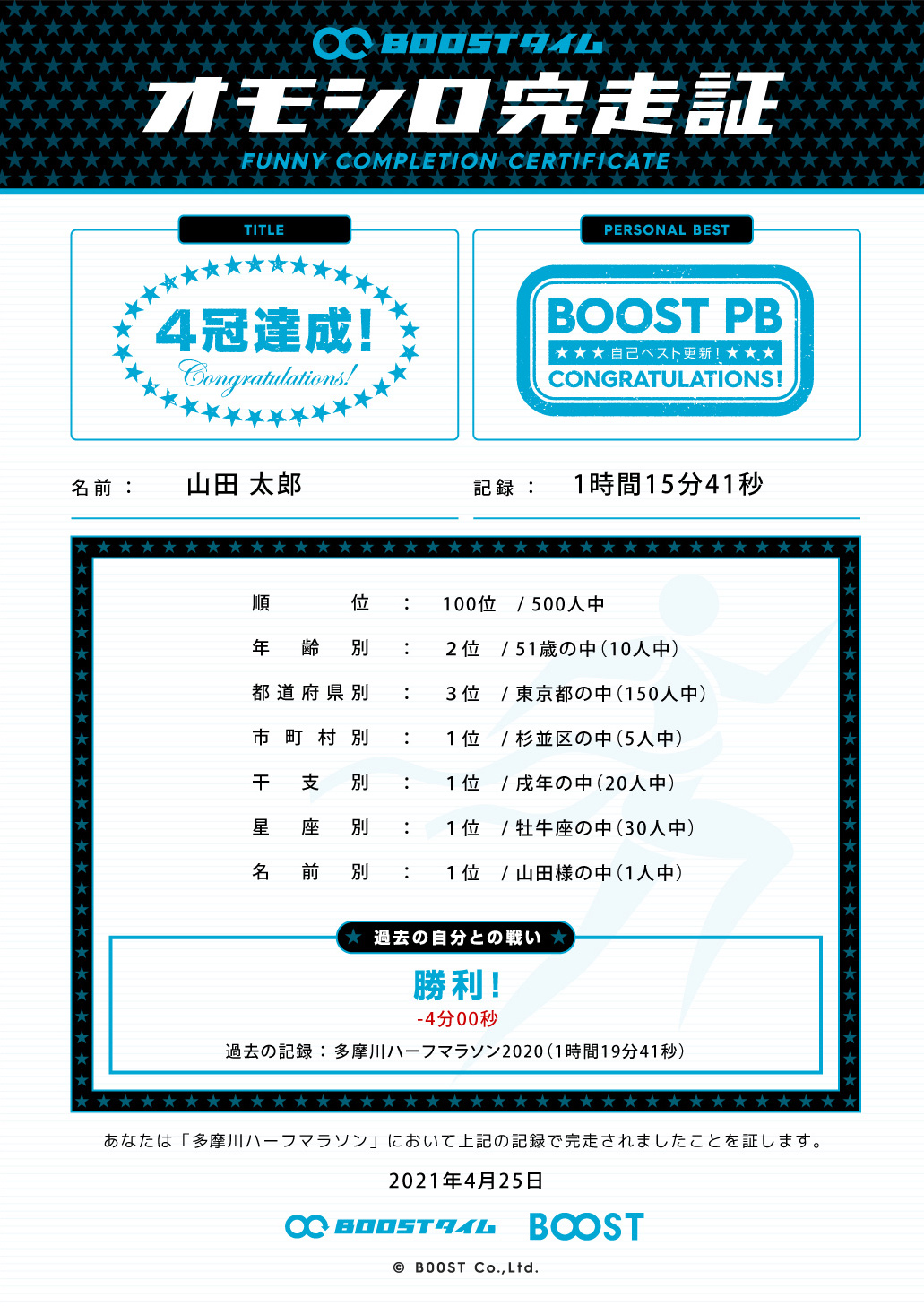 「おもしろ完走証」は全体の順位の他、以下の項目の順位が出力されます。